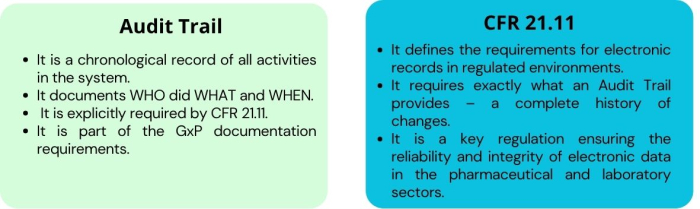 - Audit Trail zajišťuje integritu a dohledatelnost dat v souladu s požadavky 21 CFR Part 11 a principy správné výrobní praxe (GMP).